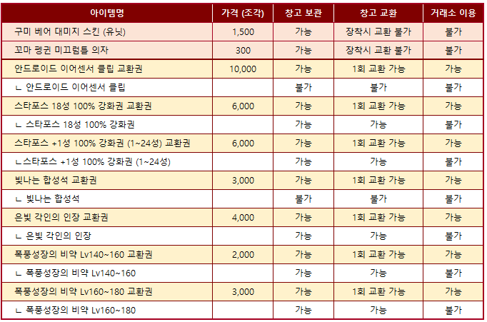 목록 중 의자/라이딩/대미지 스킨 아이템은 골드애플 업데이트 내역에 따라 변동됩니다.