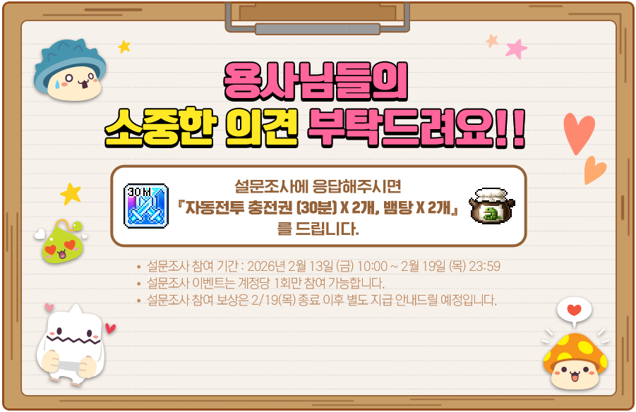 | ▶ 이벤트 기간 : 2/13(금) 오전 10시 ~ 2/19(목) 오후 11시 59분 ▶ 이벤트 내용 이벤트 기간 동안 설문조사를 끝까지 진행하신 후 설문 답변 제출을 완료해 주세요. 설문 답변 제출을 완료하신 용사님께는 이벤트 종료 후 감사의 마음을 담은 선물을 드려요. ▶ 이벤트 참여 방법 1) 메이플스토리M 게임 메인 화면 왼쪽 상단 이벤트 탭 내 설문조사 아이콘 2) 설문조사 페이지에서 [나이 확인] 및 [개인정보 수집 및 이용 동의] 항목을 체크해 주세요. (★) * 설문조사 대상 연령에 맞지 않거나, 개인정보 수집 및 이용 동의 거부 시 설문 진행이 불가합니다. 3) 설문조사 페이지 별 각 문항을 모두 체크한 후 설문 답변 제출이 완료되었다는 페이지가 확인되면 참여 완료됩니다. * 설문 진행 시 이전 페이지로 이동은 불가하니 신중히 답변 부탁드립니다. * 설문 답변 제출을 완료하신 용사님께 이벤트 보상이 지급될 예정이오니, 솔직한 답변 부탁드립니다. ▶ 이벤트 주의사항 * 설문조사는 14세 이상 용사님에 한해 계정당 1회 참여 가능합니다. * 설문을 끝까지 진행하시고 답변 제출이 완료된 용사님께만 보상이 지급됩니다. - 설문조사 대상 연령에 맞지 않거나, 개인정보 수집 및 이용 동의 거부로 설문을 끝까지 완료하지 못한 경우 보상이 지급되지 않습니다. * 설문조사 이벤트 보상은 계정당 1회 수령하실 수 있으며, 이벤트 종료 후 지급됩니다. - 보상 정보: 자동전투 충전권(30분)*2개, 뱀탕*2개 (기간제 7일) - 설문조사 이벤트 보상 지급 시 본 공지 내 추가 안내 드릴 예정입니다. |