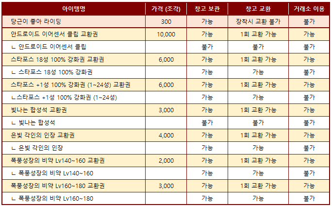 목록 중 의자/라이딩/대미지 스킨 아이템은 골드애플 업데이트 내역에 따라 변동됩니다.