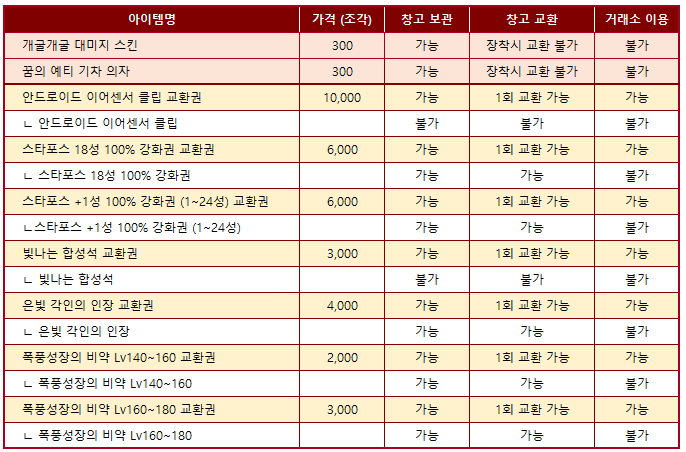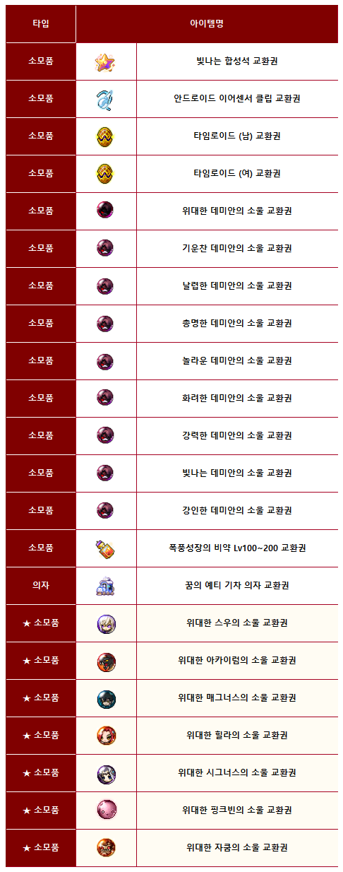- 대상 아이템 (★) : 위대한 스우 / 아카이럼 / 매그너스 / 힐라 / 시그너스 / 핑크빈 / 자쿰의 소울 교환권